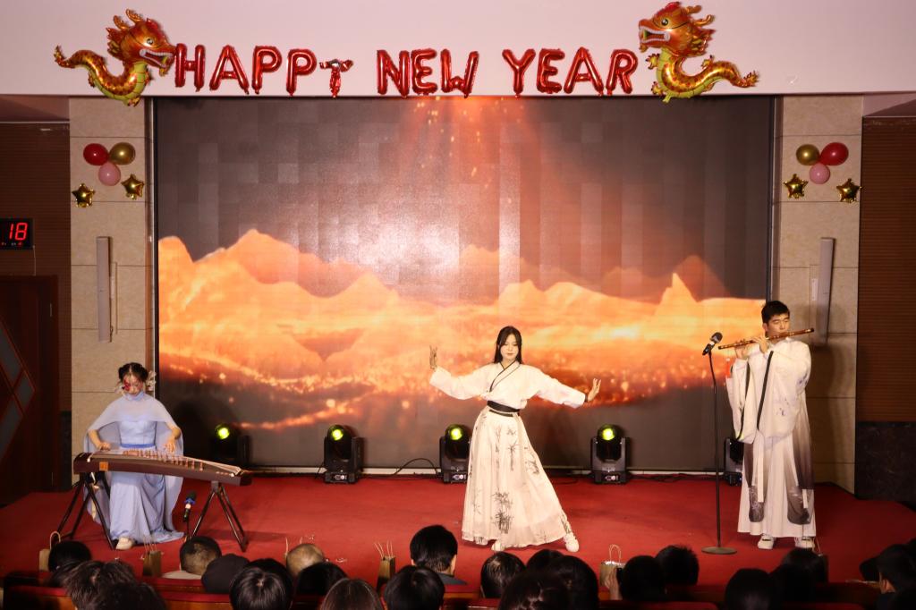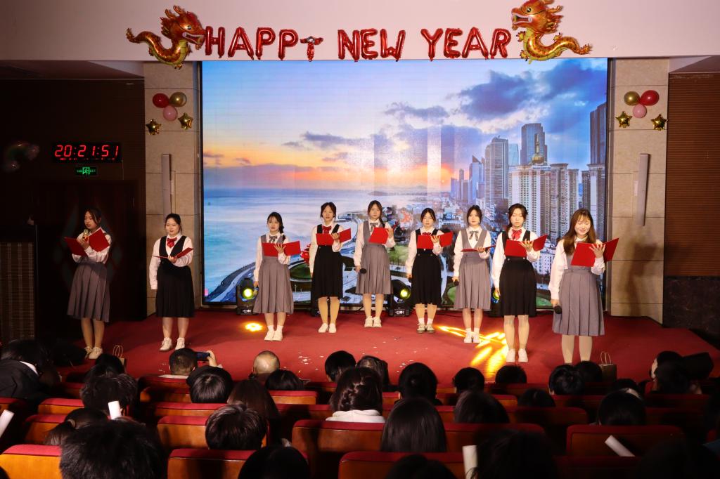 接下来演员们有序上台进行表演,《童谣狂欢》活泼快乐,勾起同学们童年记忆;《七五礼仪颂,齐鲁新征程》具有专业特色,展示学生风采;《黄河的女儿》聚焦黄河国家战略,催人奋进……晚会12个节目各具特色,别出心裁,营造了浓厚的跨年氛围。