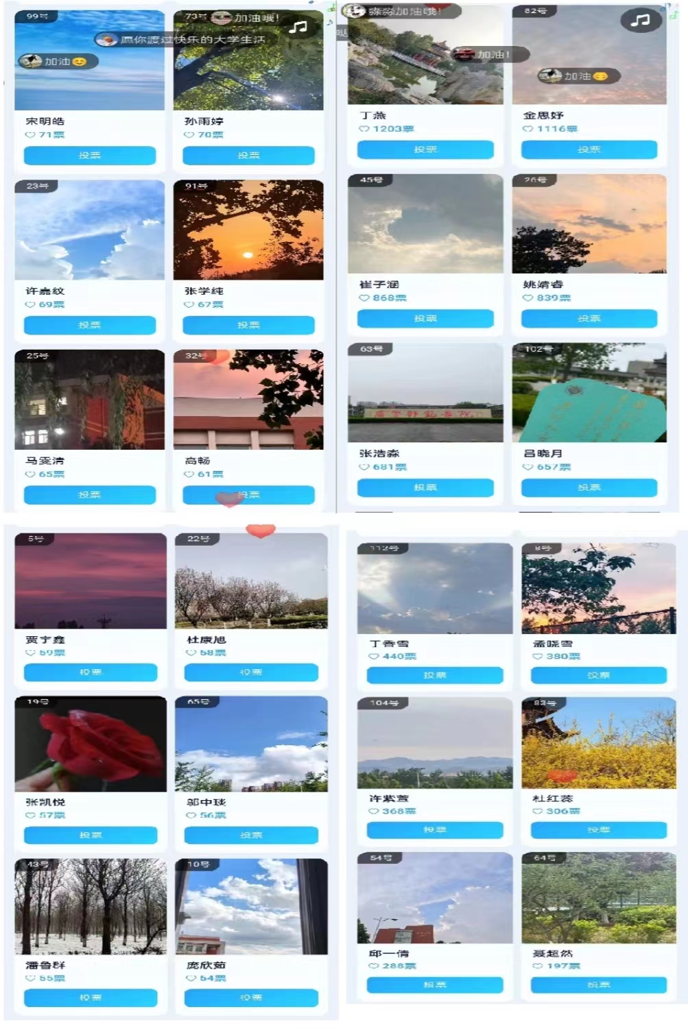 本次活动采用网络小程序平台投票方式进行,同学们于6月14日开始进行活动报名,纷纷将自己拍到的非常满意的照片上传小程序报名参加本次活动。6月16日本次活动开始投票,在一周的投票时间内。同学们通过自己上传作品所体现的校园风采和通过家人朋友们的帮助,获得了较高的选票,助力本次活动的顺利举行。在活动的最后一天,同学们仍坚持拉票,使我社团本次活动取得了。13556张选票这一华丽数据,取得了较大成功。