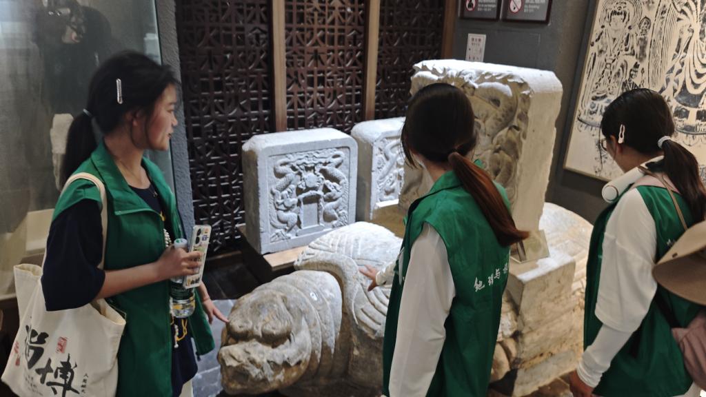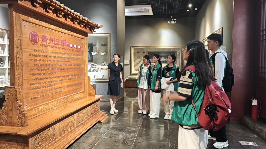 在展馆讲解员专业而细致的引导下,团队成员们开启了认识“青州三雕”之旅。讲解员向我们详细介绍了三雕历史。青州三雕,作为山东青州地区独具特色的传统雕刻艺术,承载着深厚的齐鲁文化和精湛的民间工艺精神。它主要包括砖雕、石雕和木雕三种形式,每一种都蕴含着独特的艺术价值和历史传承。青州砖雕以其精细的刀工和丰富的题材著称,常用于建筑装饰,如门楼、照壁等,图案多为花鸟鱼虫、人物故事,刀法细腻,层次分明,展现出青州工匠对生活的细腻观察和高超的艺术表现力。石雕则多选用当地优质石材,作品涵盖人物、动物、器物等,线条流畅,造型生动,既有北方的豪迈粗犷,又不失南方的灵秀精致,广泛应用于园林景观和公共空间,成为城市文化的重要载体。木雕更是青州三雕中的精华,选用优质木材,经过锼、刻、雕、镂等多种技法,创作出屏风、门窗、家具等实用与观赏兼备的作品,图案寓意吉祥,工艺复杂精湛,彰显出木雕艺人的智慧和匠心。青州三雕不仅具有极高的艺术欣赏价值,更是齐鲁文化的重要组成部分,它见证了青州地区的历史变迁和社会发展,是研究古代民间艺术、建筑装饰和民俗风情的珍贵实物资料。如今,青州三雕在传承与创新中不断发展,艺人们在保留传统技艺的基础上,融入现代设计理念,使其在当代社会焕发出新的生机与活力,为青州的文化传承和经济发展贡献着独特的力量。讲解员深入浅出的解说,将尘封的史料转化为鲜活的历史故事,使大家对古城承载的厚重文化底蕴有了系统性认知。