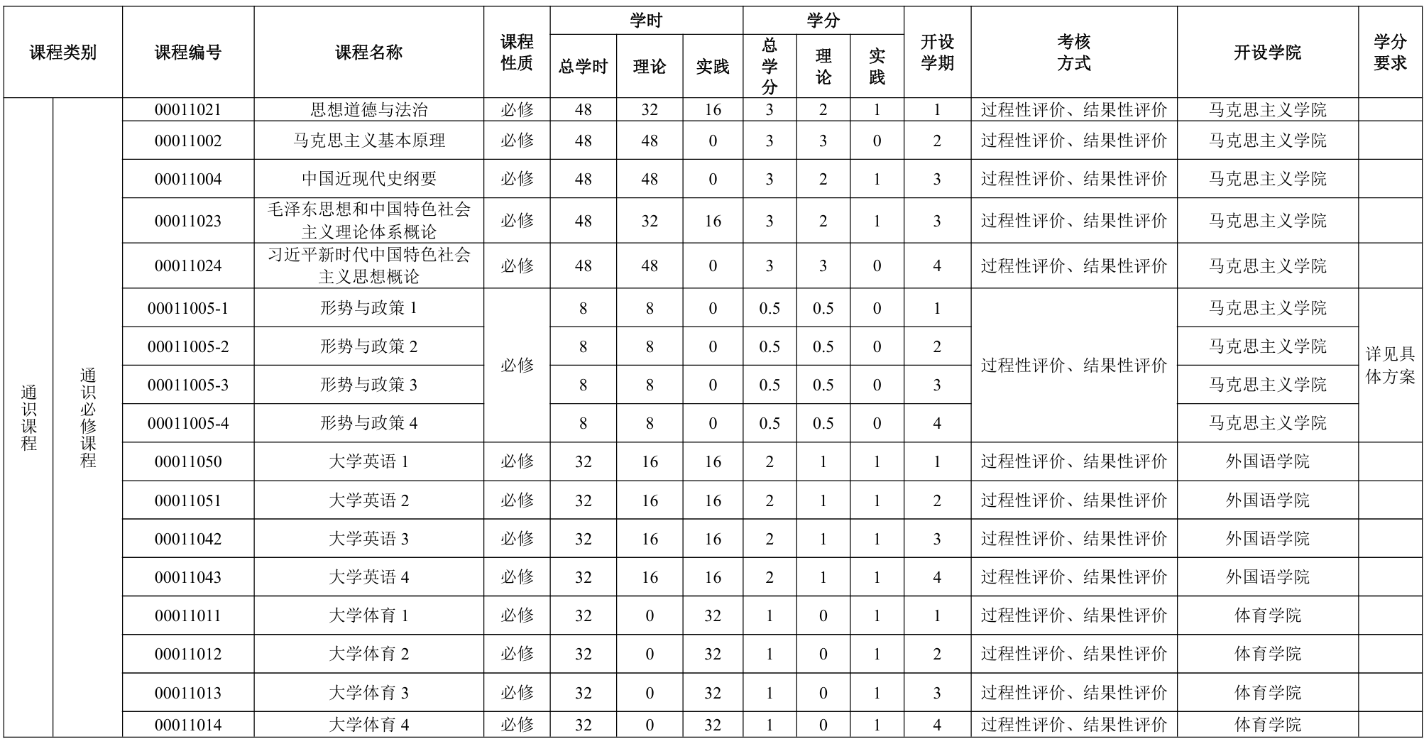 通识必修课,由任课教师或相关部门进行考核,考核方式由承担课程教学任务学 院根据教学大纲要求确定。综合考核达不到及格要求(或不足60分)必须重修。通过证书认定学分的课程由教务处根据相关规定进行认定。