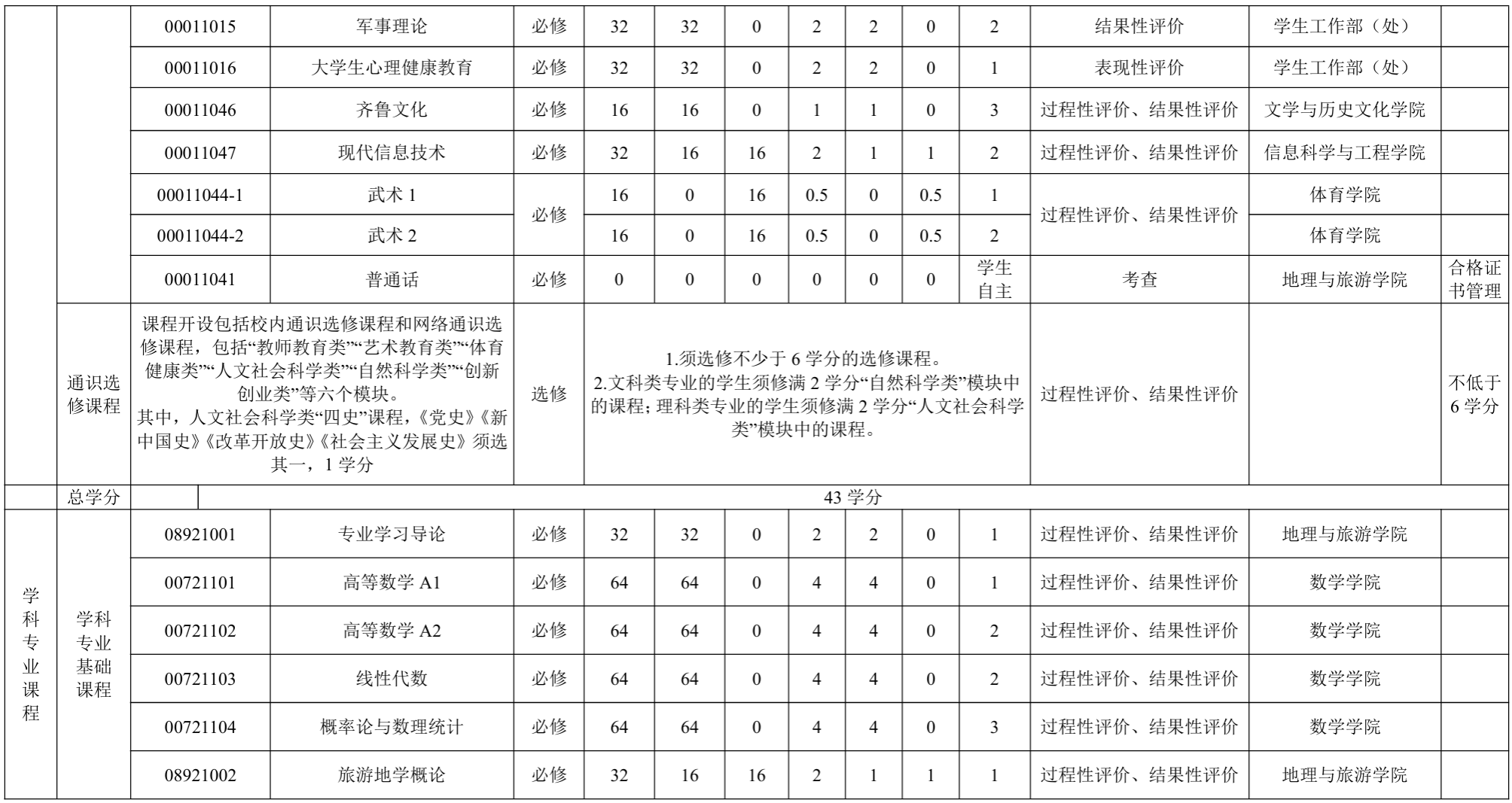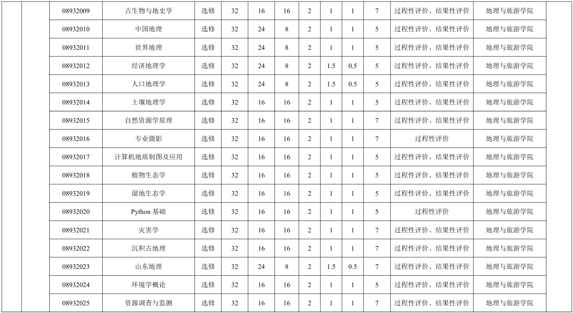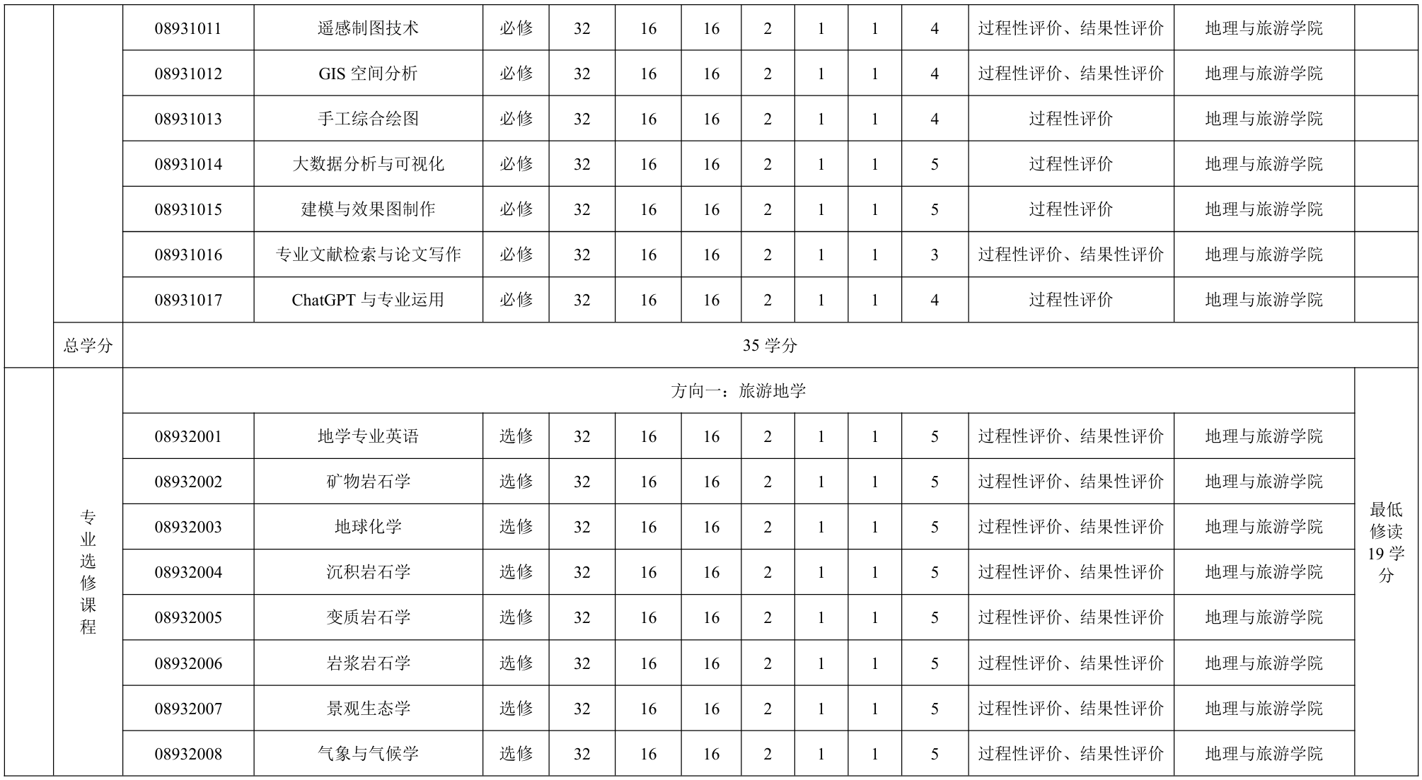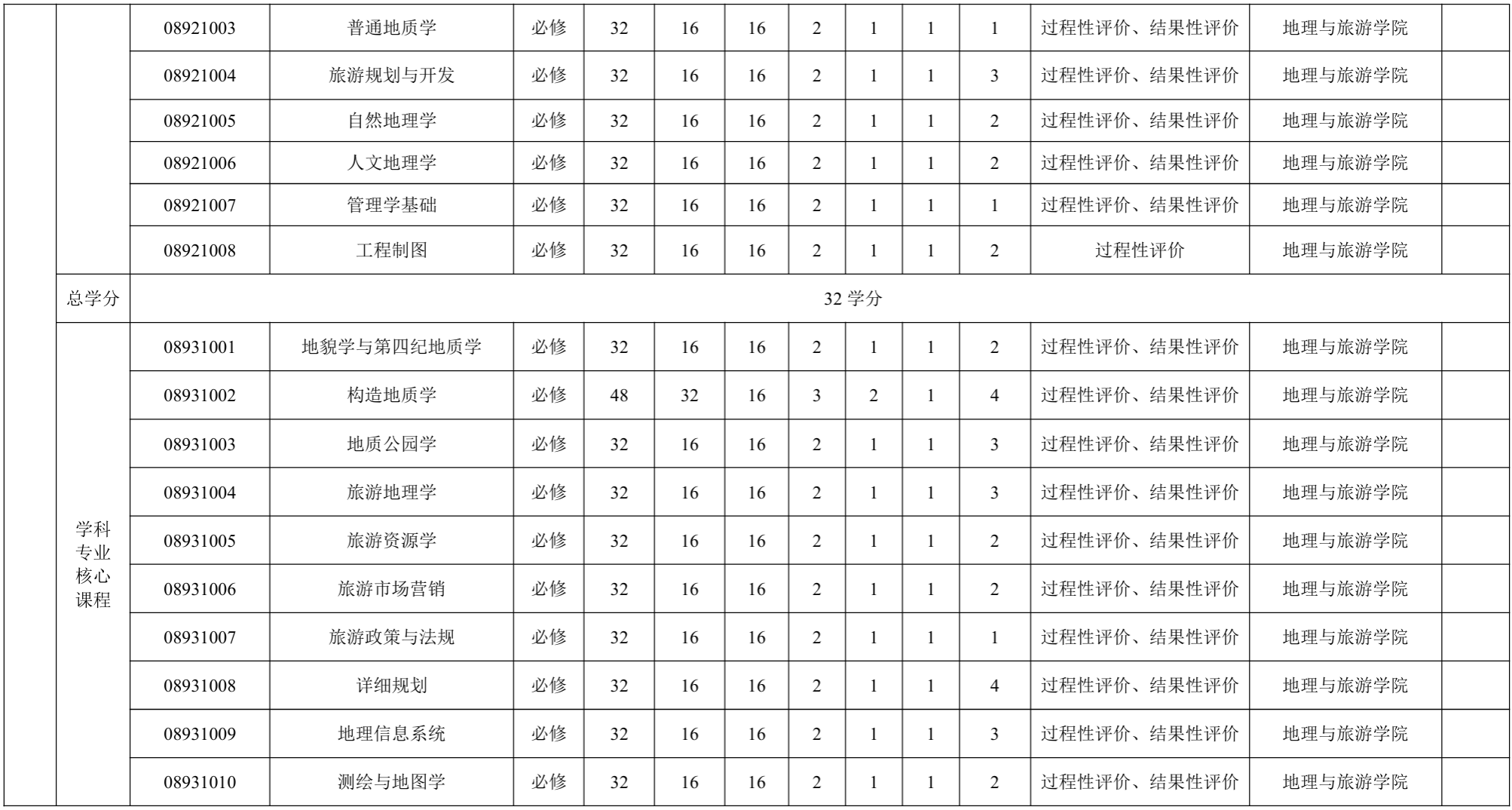 专业基础课程与核心课程:旅游地学概论、构造地质学、地貌与第四纪地质学、 旅游资源学、旅游规划与开发、测绘与地图学、地理信息系统、自然地理学及人文地理学等课程。