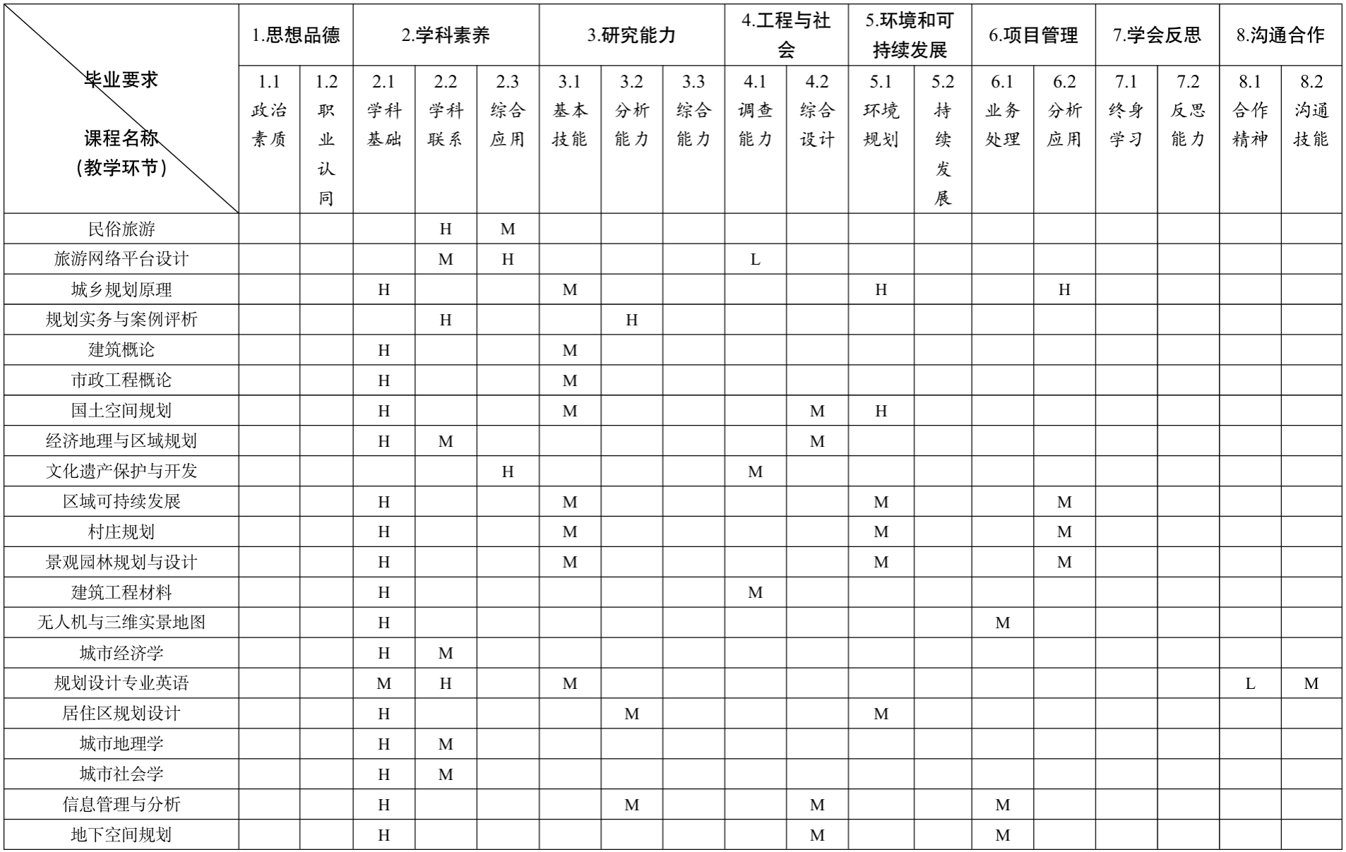 1.【职业规范】具有坚定的政治方向,践行社会主义核心价值观,增进对习近平 新时代中国特色社会主义思想的认同。能够在旅游资源的规划、开发和管理中遵守工 程职业道德规范,履行责任,承担义务。
