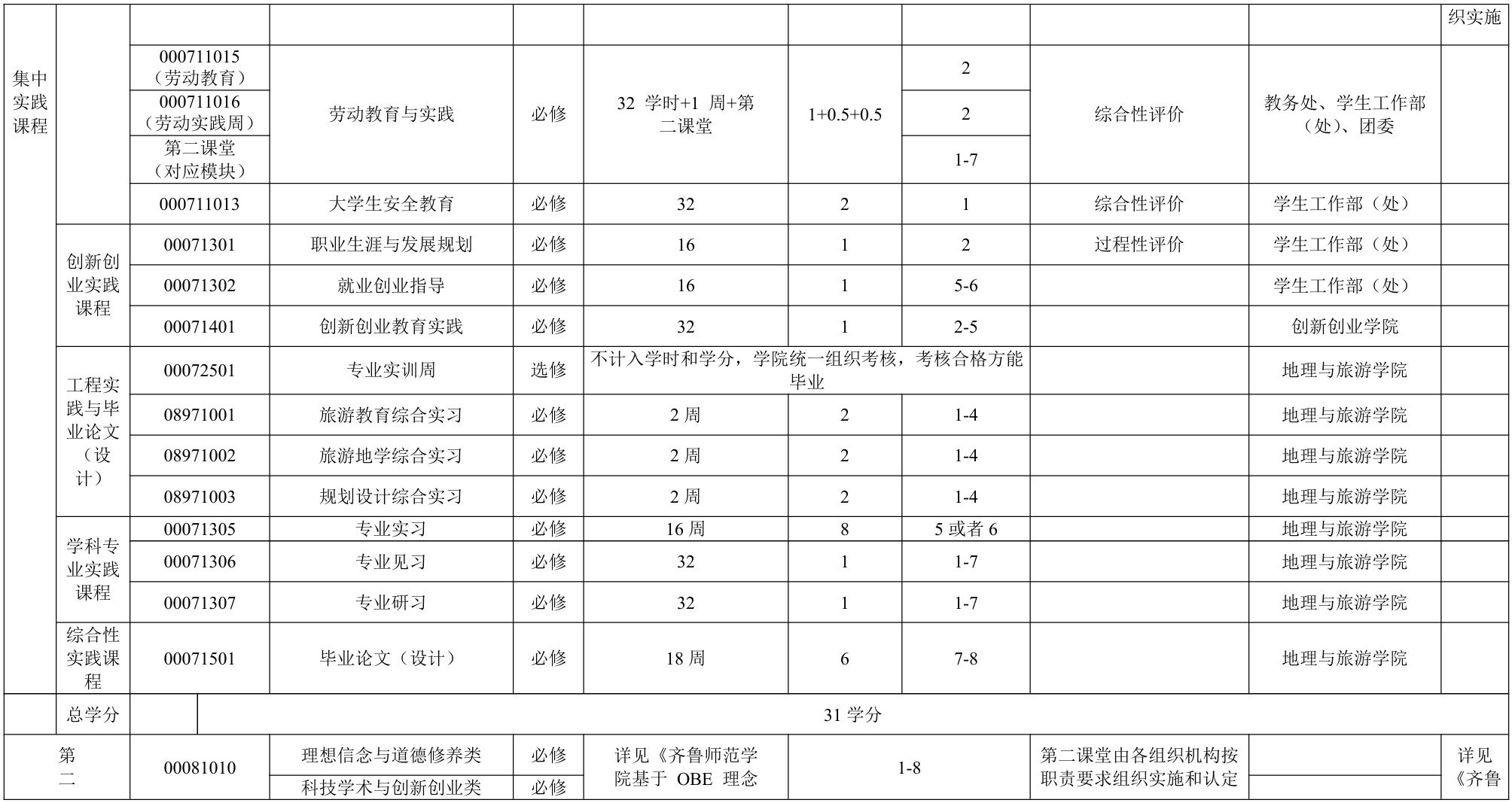主要实践性教学环节:国防教育与军事训练、旅游地学综合实习、旅游教育综合实习、规划设计综合实习、就业创业指导、创新创业教育实践、劳动教育、专业实习、毕业论文(设计)等。