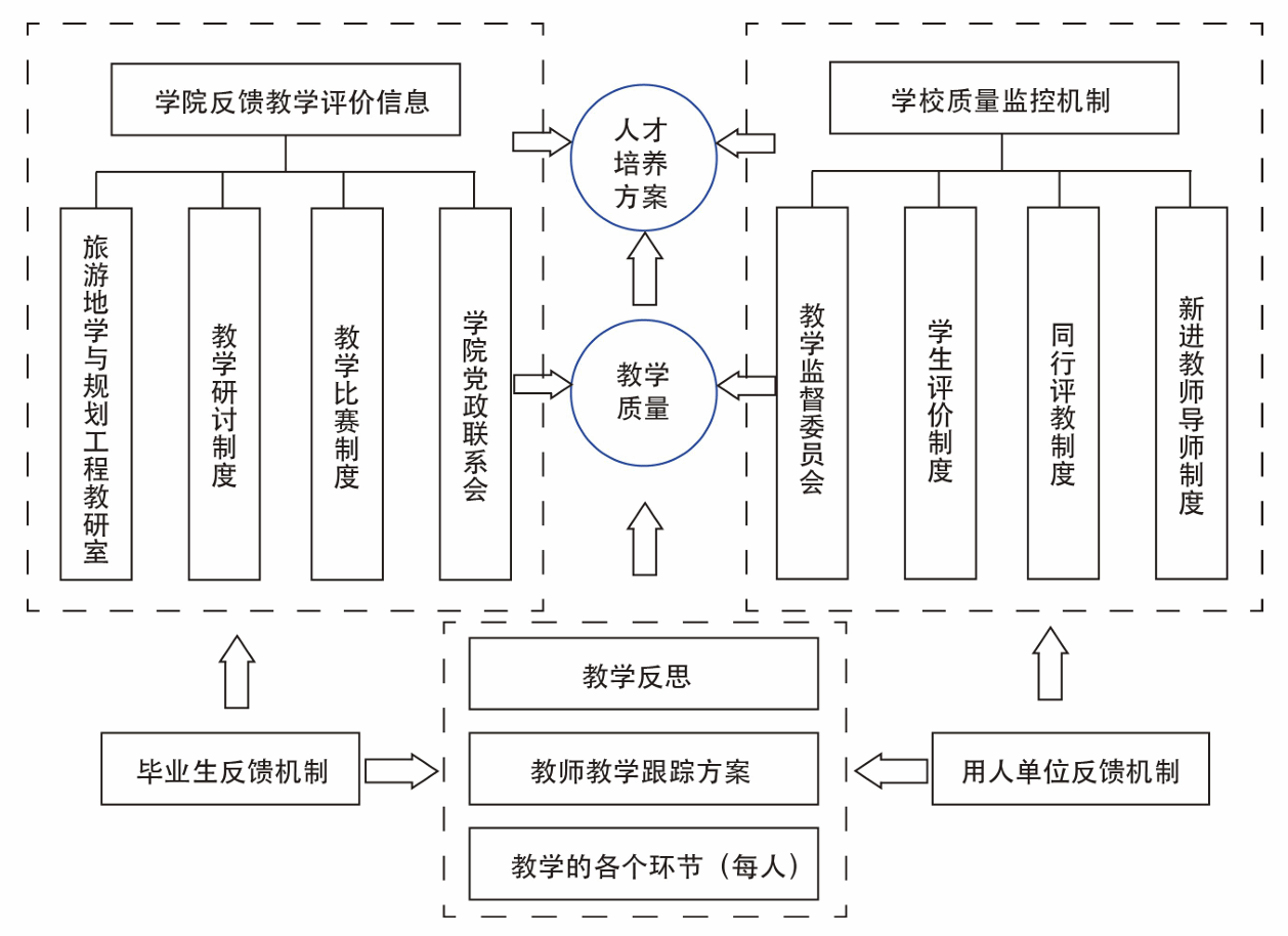 在利用学校质量监控机制、学院反馈教学评价信息、教师教学反思的闭环结构基础上,基于成果导向教育理念(OBE),构建“旅游地学与规划工程专业教学质量保障、反馈和持续改进机制”。其主要框架如下: