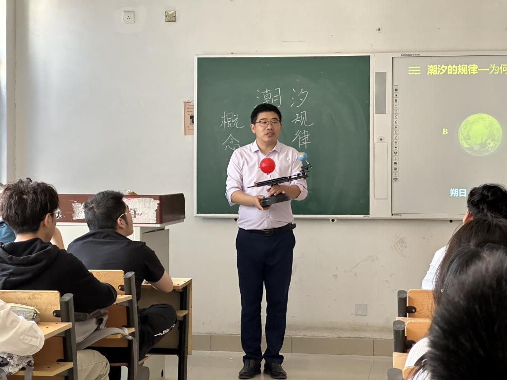 李云龙老师授课内容为《自然地理学》第四章第三节《潮汐》,包含“潮汐的概念、潮汐的成因、潮汐的规律和潮汐的影响”四个知识点。李老师的课堂创设以问题为导向的教学模式,激发学生的探究性,提升学生获得感,体现了以学生为中心的教学理念;课堂设计了模型操作,融入地理信息技术,利用“三球仪”、VR技术和虚拟技术来还原天体关系,突破重难点;采用线上线下混合式教学,无论是自主思考还是小组讨论,都强化了学生的“学”、弱化了教师的“教”,将课堂还给学生,让学习在思考与实践中真实发生。除此之外,李老师的课堂还坚持立德树人的价值目标,通过认识潮汐规律,推动海洋强国建设,有效落实了立德树人,课程思政。