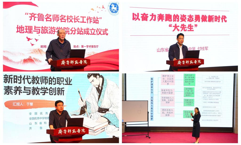 齐鲁名校长——济南济微中学党总支书记、济微教育集团总校长陈树洪,齐鲁名师——广饶一中教师付桂军、荣成三中教师于慧、淄博柳泉中学教师聂隽应邀出席。yl23455永利集团党委委员、统战部部长宋新刚,YL23455永利集团党委书记秦拓、院长王敏、党委副书记王志勇、副院长郭斐、惠洪宽(挂职)及地理科学(师范类)专业全体师生参加活动。