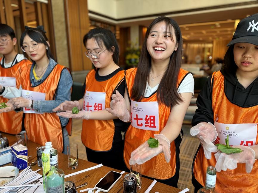 同学们到达酒店后,各部门负责人发表了热情洋溢的欢迎辞,酒店总经理黄寅仓先生与大家分享了酒店管理经验。欢迎致辞结束后,人力资源负责人简单介绍了见习活动的要求与规则,将同学们分成八组,每个组的组长都是酒店各部门的经理,各小组组长带领同学们,进行了大堂吧-莫吉托鸡尾酒制作、全日制餐厅-西式摆台、豪华阁-欢乐时光水果拼盘制作、楼层-新娘房装饰(叠天鹅)、洗衣房-折叠布草/衣物、健身中心-跑步机操作并体验、礼宾部-行李车操作并托运物品到宴会厅、宴会厅-练习使用托盘服务、倒酒服务等活动,在亲身体验酒店各部门工作的同时获得任务线索,最先完成任务解密电话号码的小组获胜,该专业见习活动,让同学们深入了解了酒店各部门工作的内容,同时对香格里拉的文化和管理有了新的认识。