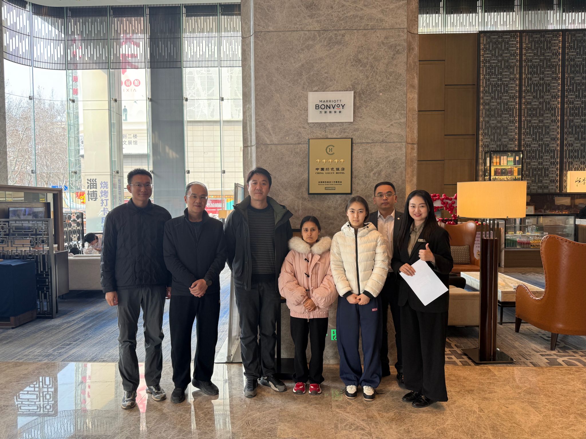在淄博万豪大酒店, 酒店负责人介绍了淄博万豪大酒店未来发展规划,及对旅游管理、酒店管理高素质人才的需求意向。秦拓书记结合淄博文旅产业资源优势,建议双方联合开展行业调研、技能竞赛等活动,提升学生实践创新能力。此次走访为双方深度合作筑牢基础,下一步将推进课程体系共建,实现人才培养与企业需求的精准对接。