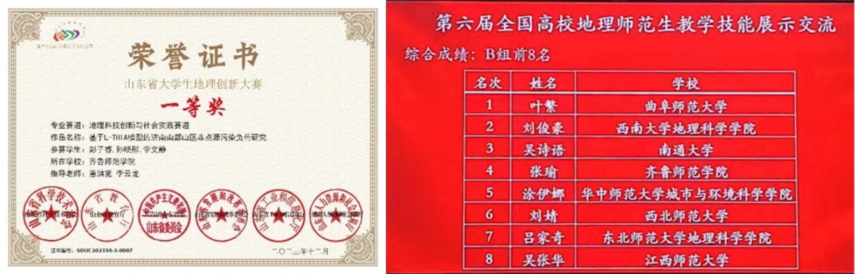 持续强化实践教学环节,完善实践教学体系,全方位提高学生实践创新能力。2023年山东省师范类高校学生从业技能大赛,地理科学专业学生获得二等奖2名,三等奖2名; 2023年山东省地理创新大赛,荣获一等奖1名,二等奖2名,三等奖2名,第六届全国高校地理师范生教学技能展示交流中荣获一等奖1名, 2023届地理科学专业的考研率为28.5%。
