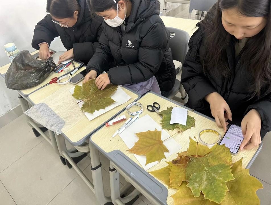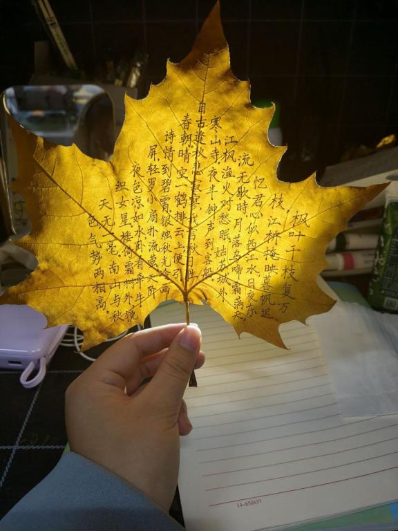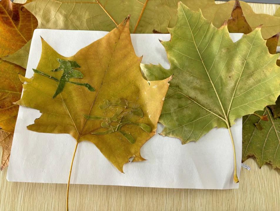在活动现场,学生们充分发挥想象力,化平凡为神奇。有的以叶为“纸”,笔锋游走叶脉之间;有的依托于树叶的独特形态,将其化作字的一“画”……同学们在书法与叶影的交织中,深刻感受到了书法的独特魅力,也感受到了传统文化的蓬勃生机与创新活力。