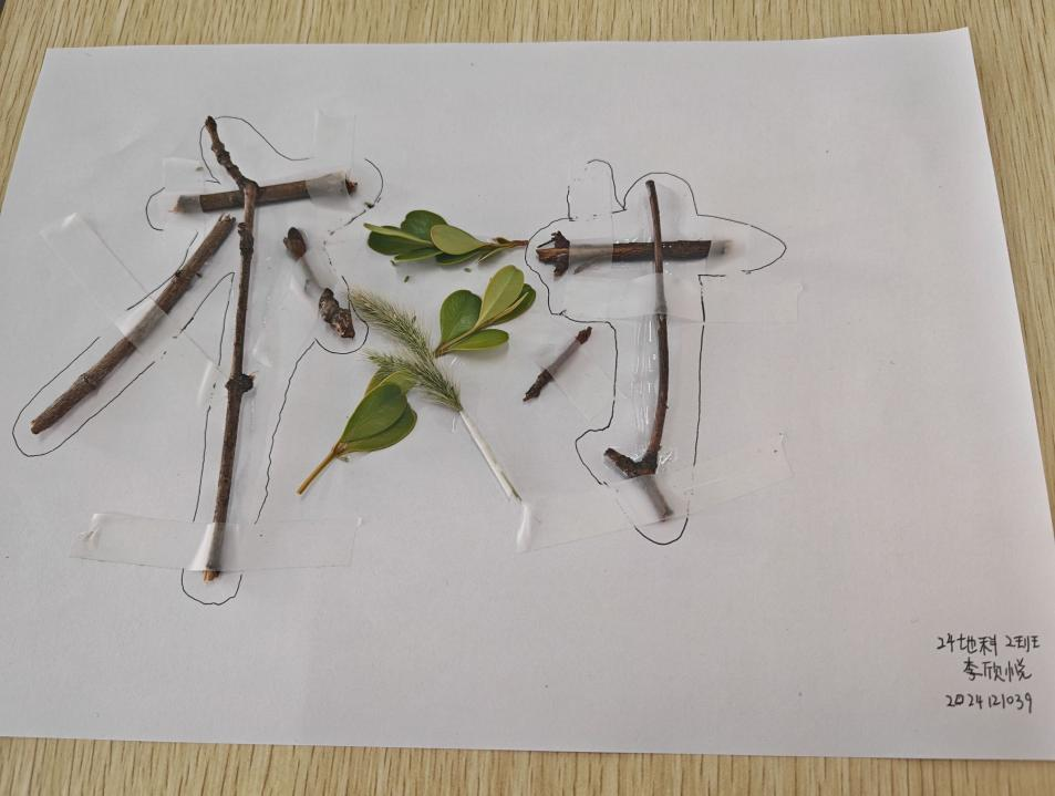 该活动打破传统书法创作边界,鼓励学生们运用塑料袋、土壤、树枝、树叶等日常常见物品作为书写材料,载体不拘一格,巧妙利用树叶的独特形态,将书法艺术与之完美融合。