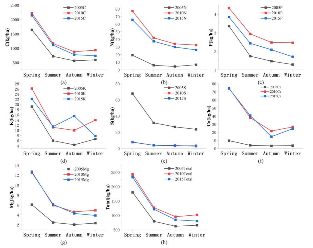 Figure3.Seasonal changes in nutrient regression of each nutrient in total litter in different years. (a) C, (b) N, (c) P, (d) K, (e) S, the data for 2010 and 2015 are close and the curves almost coincide, (f) Ca, (g) Mg, (h) Total.