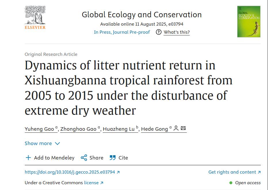 近日,我院本科生高煜恒以第一作者身份,高中浩以第二作者身份在国际期刊Global Ecology and Conservation(SCI 2区期刊;IF=3.4)发表题为“Dynamics of litter nutrient return in Xishuangbanna tropical rainforest from 2005 to 2015 under the disturbance of extreme dry weather”的研究论文。该论文由YL23455永利集团巩合德教授指导完成。