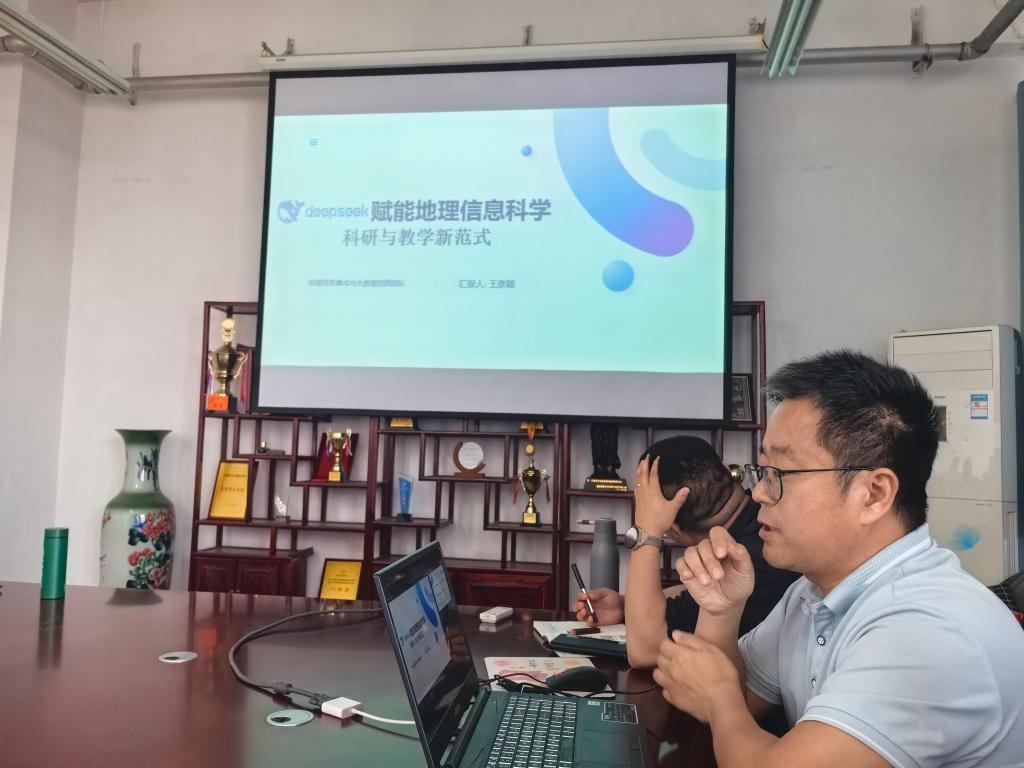 首先由地理信息集成与大数据挖掘团队负责人王彦颖副教授作“Deepseek赋能地理信息科学科研与教学新范式”学术报告。报告全面展示了Deepseek在地理信息系统领域取得的技术突破和创新应用,并结合阿里云AI Earth、谷歌地球等前沿技术案例。随后,王彦颖同与会老师们深入探讨了地理信息技术在科研与教育场景中的创新发展路径。