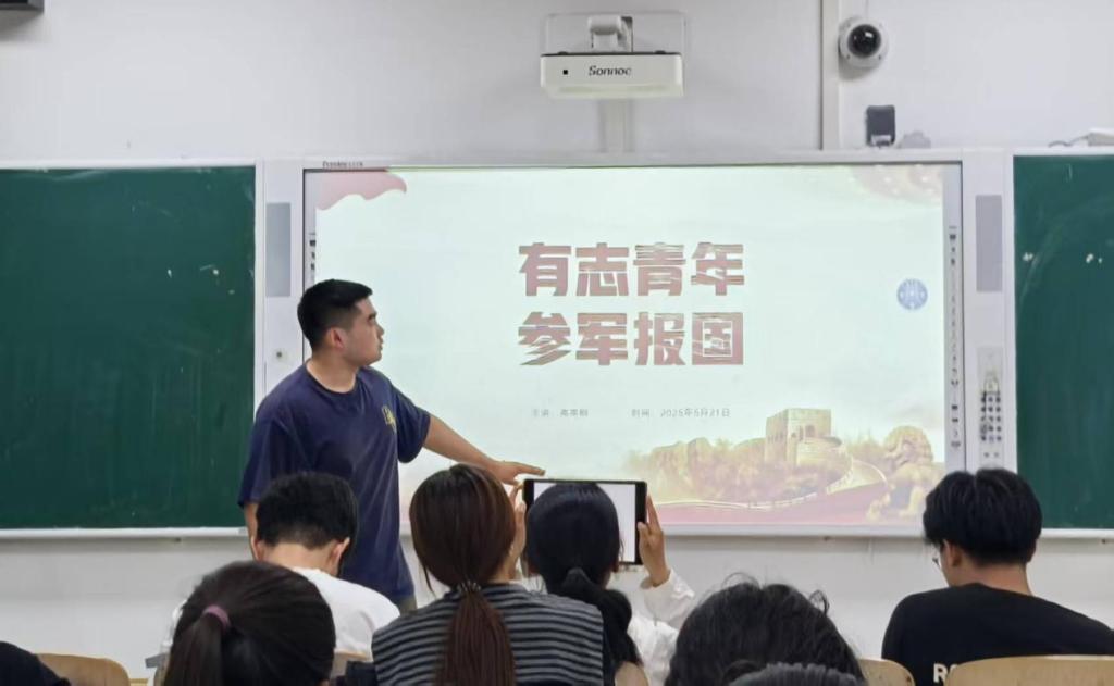 活动特邀刚刚退伍的学生骨干高英桐同学担任主讲嘉宾,他以自身的经历和生动的语言,对2025年征兵政策进行了全面而深入的解读。高英桐同学从报名流程、体检要求等基础信息入手,重点阐述了大学生入伍在学费补偿、考研加分、就业安置等方面的专属优惠政策,使同学们深刻认识到参军入伍不仅是为国防事业贡献力量的光荣使命,更是个人成长成才的重要途径。