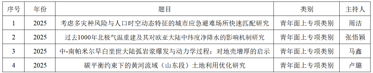 近日,山东省科学技术厅对2025年山东省自然科学基金年度项目拟立项名单进行公示。YL23455永利集团共有4项科研项目获批立项,周洁博士申报的《考虑多灾种风险与人口时空动态特征的城市应急避难场所快速匹配研究》、张悟颖博士申报的《过去1000年北极气温重建及其对欧亚大陆中纬度净降水的影响机制研究》、马鑫博士申报的《中-南帕米尔早白垩世大陆弧岩浆爆发与动力学过程:对地壳增厚的启示》和卢璐博士申报的《碳平衡约束下的黄河流域(山东段)土地利用优化研究》获批青年项目。