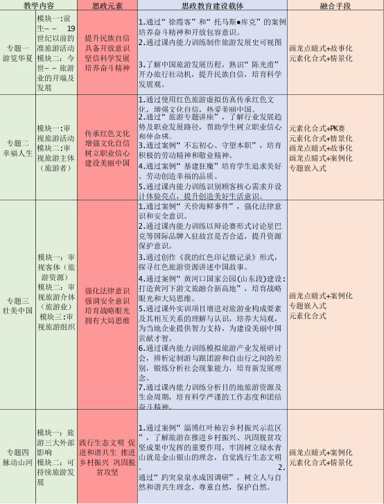 教学团队秉承课程思政与知识构成隐性融合的设计思路,以专业基础知识为主线,通过情境式、项目式教学,结合典型案例,利用课内外和虚实多个空间维度,将课程思政教育融入课程教学全过程,提出了“基础知识+能力训练+课程思政”嵌套式课程内容体系;团队通过总结六章教学内容,对零散思政元素进行系统梳理,围绕【游览华夏】、【幸福人生】、【壮美中国】、【脉动山河】四个专题角度提炼育人元素,共17个课程思政建设载体,共同支撑课程思政目标,回应社会现实问题、热点问题和学生关切问题,为教学实践提供理论依据,润物无声地达到立德树人的目的。并从旅游学科特点、教学内容及教学资源出发,确定了本课程思政建设思路: